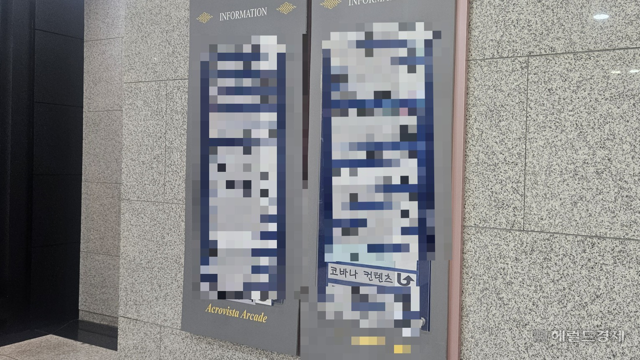 | 아크로비스타 지하상가에는 김건희 여사가 운영했던 ‘코바나컨텐츠’의 명패가 남아있다. 박지영 기자. |