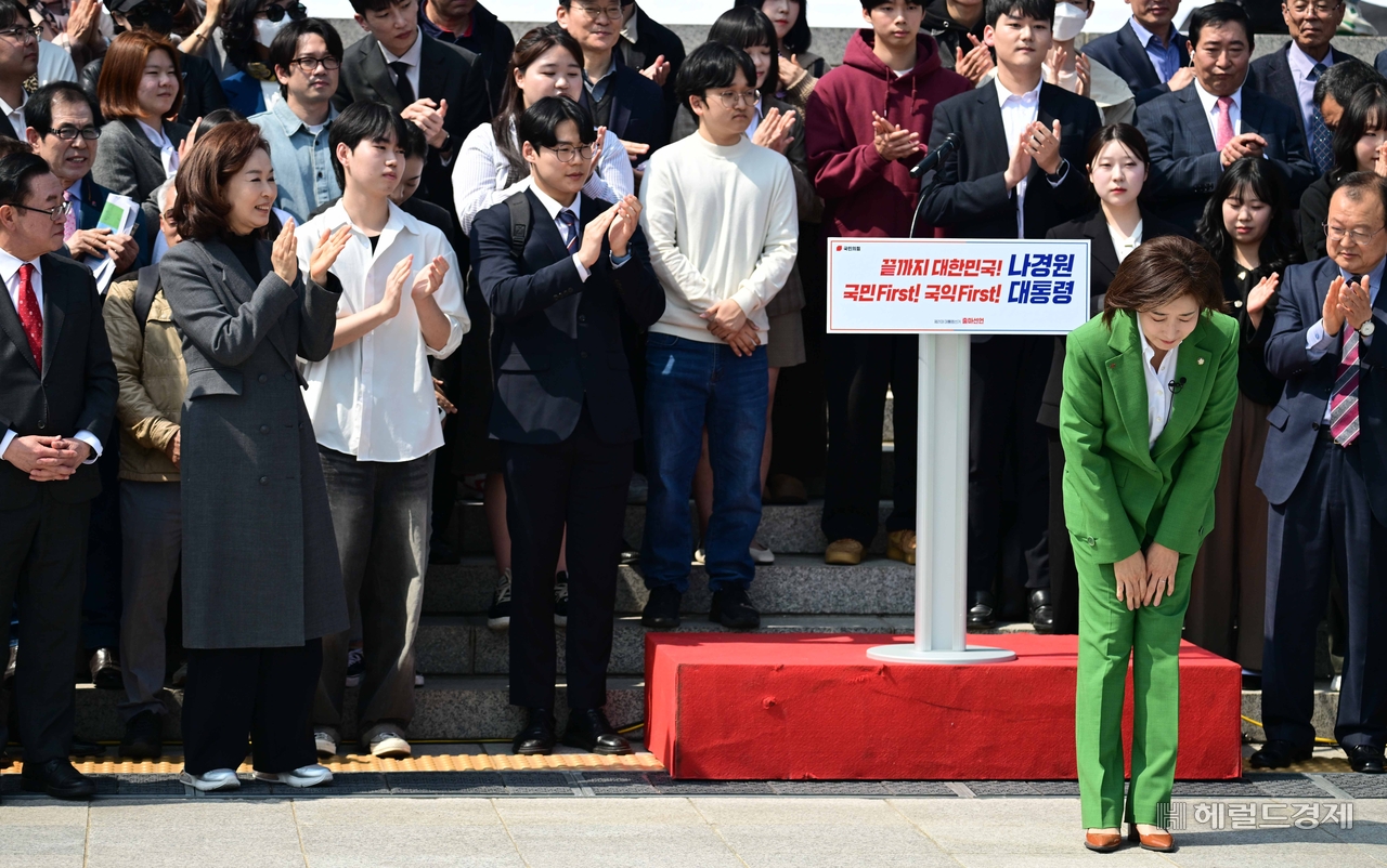 [헤럴드pic] 인사하는 나경원 국민의힘 의원 글꼴 선택 본문 텍스트 크게본문 텍스트 작게 인쇄 [헤럴드경제=이상섭 기자] 나경원 국민의힘 의원이 11일 서울 여의도 국회 본청 앞 계단에서 대선 출마 선언에 앞서 지지자들에게 인사를 하고 있다.