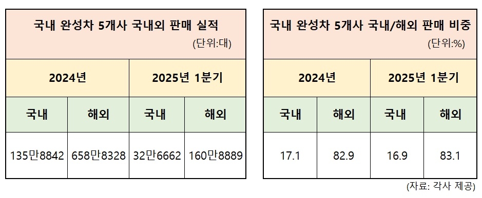 올해 1분기(1~3월) 국내 5개사 전체 판매량(192만8675대)에서 수출(160만8889대)이 차지하는 비중 역시 전년과 비슷한 수준인 83%로 나타났다.