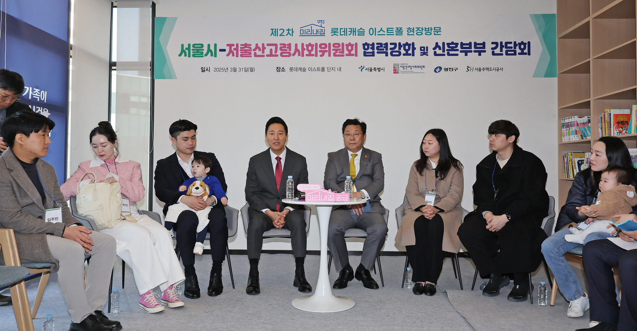 | 오세훈 서울시장(왼쪽 네 번째)과 주형환 저고위 부위원장이 3월 31일 서울 광진구 롯데캐슬 이스트폴에서 열린 ‘미리내집 현장방문 및 신혼부부 간담회’에서 입주 예정 신혼부부들과 간담회를 하고 있다. [연합] |