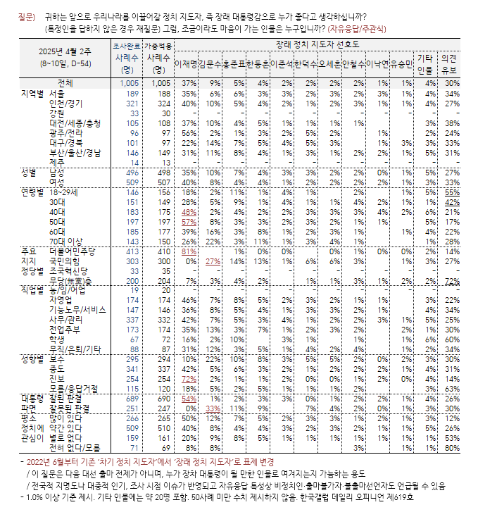 이 전 대표와 28%p 차이를 보인 김문수 전 고용노동부 장관이 9%를 기록하며 2위를 차지했다. 야권 잠룡 가운데선 1위다. 김 전 장관은 올해 발표된 한국갤럽의 장래 정치 지도자 선호도 정례 조사에서 줄곧 이 전 대표에 이어 2위를 기록 중인데, 최근 장관직에서 물러나고 대선 출마를 선언했다.