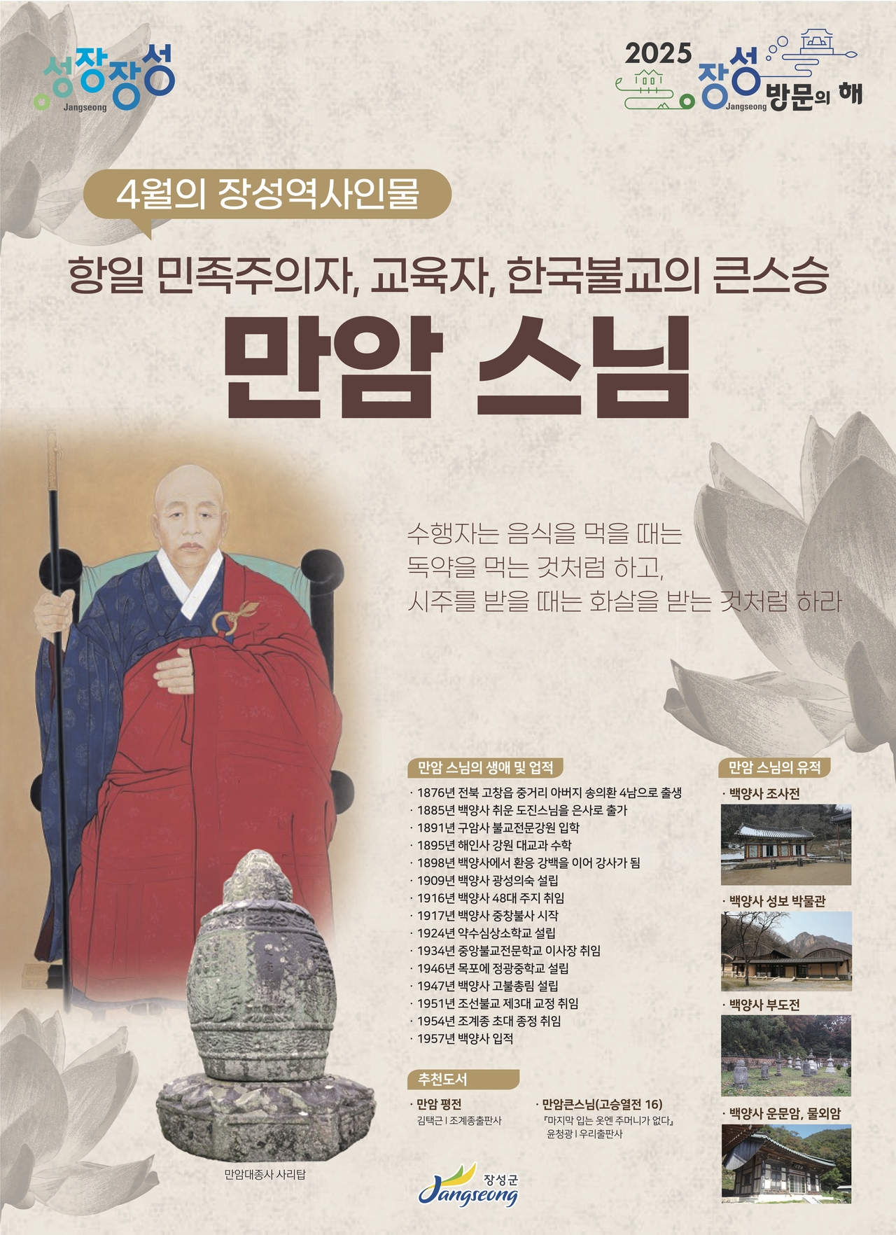 [헤럴드경제(장성)=김경민기자]장성군이 4월의 장성역사인물로 ‘만암 스님’을 선정했다고 밝혔다.