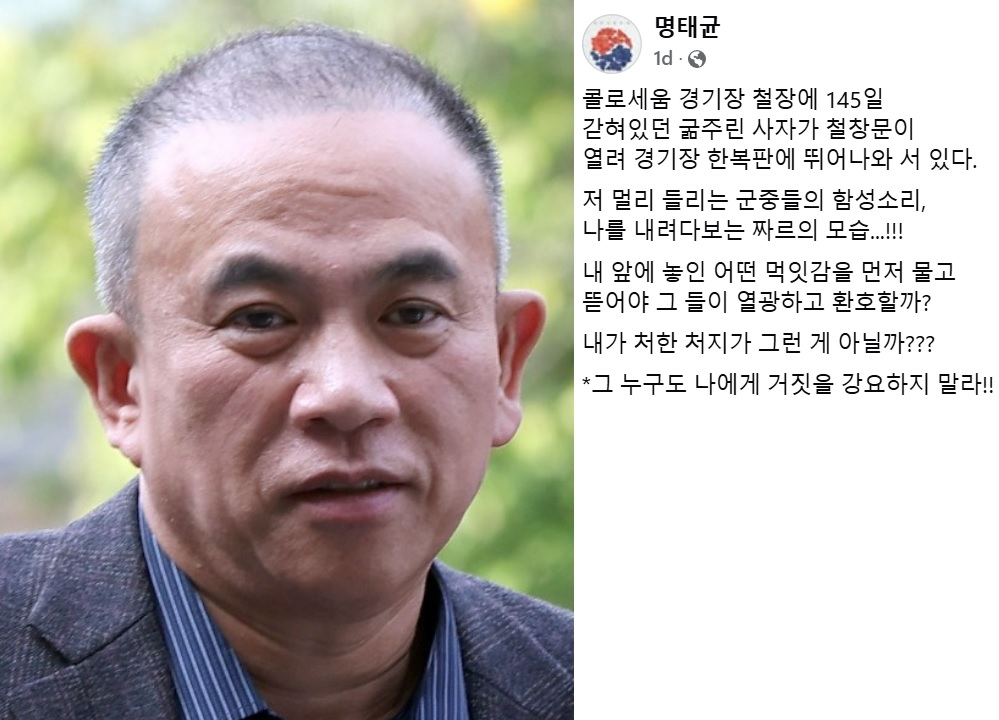 명 씨는 지난 13일 페이스북에 “콜로세움 경기장 철장에 145일 갇혀 있던 굶주린 사자가 철창문이 열려 경기장 한복판에 뛰어나와 서 있다”로 시작하는 글을 올렸다.