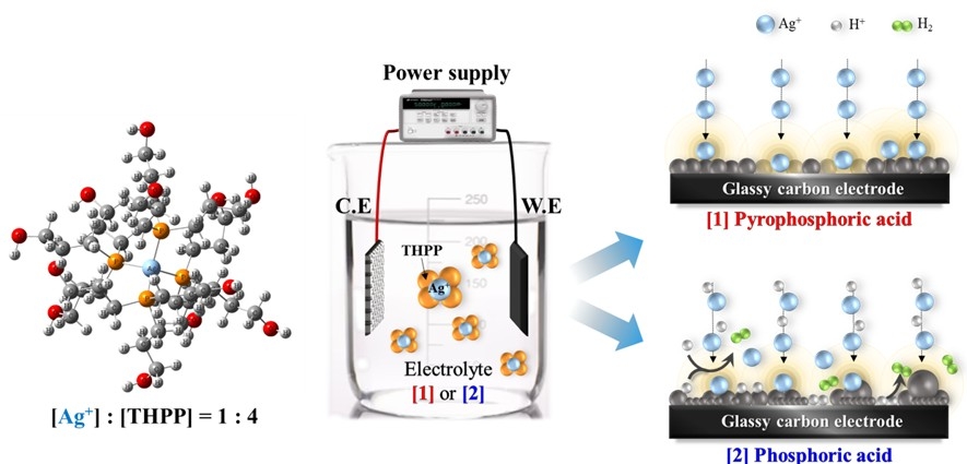 | 은 이온과 THPP간 착화형태의 분자구조 예측 및 전해질 별 은 도금층 전착 거동을 나타낸 그림.[한국재료연구원 제공] |