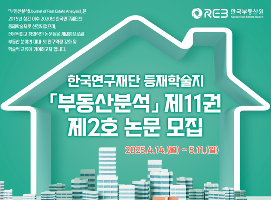 김근용 한국부동산원 연구원장은 “등재학술지 ‘부동산분석’ 논문 모집을 통해 연구자의 독창적인 연구를 지원하고, 심도 있는 결과가 부동산 산업 발전에 기여할 수 있도록 노력하겠다”고 말했다.