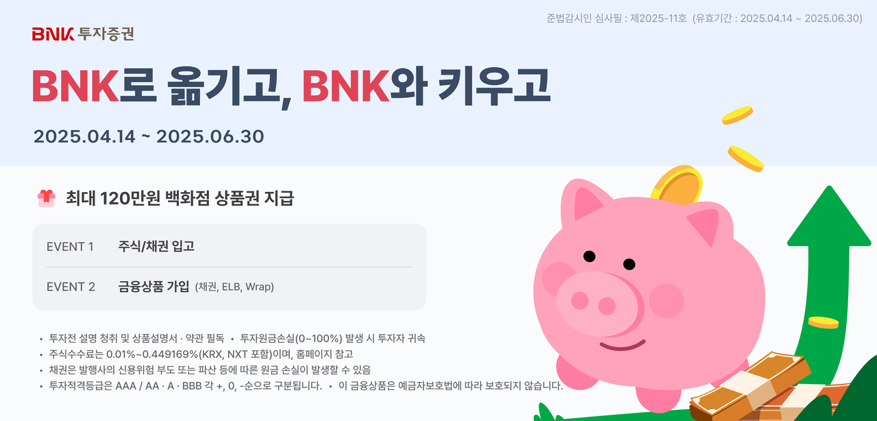 [헤럴드경제(부산)=조아서 기자] BNK투자증권은 오는 14일부터 6월 30일까지 주식·채권 순입고 및 금융상품 가입 고객에게 최대 120만원 상당의 백화점 상품권을 제공하는 이벤트를 진행한다고 14일 밝혔다.