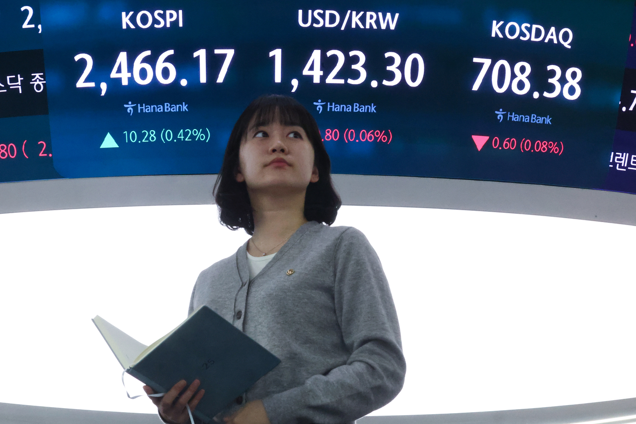 | 15일 오전 서울 중구 하나은행 본점 딜링룸 현황판에 코스피, 원/달러 환율, 코스닥 지수가 표시돼 있다. 이날 코스피는 전장보다 8.62p(0.35%) 오른 2464.51로, 코스닥 지수는 전 거래일보다 0.53p(0.07%) 오른 709.51로 시작했다. 원/달러 환율은 전장보다 2.1원 내린 1422.0원으로 출발했다. [연합] |