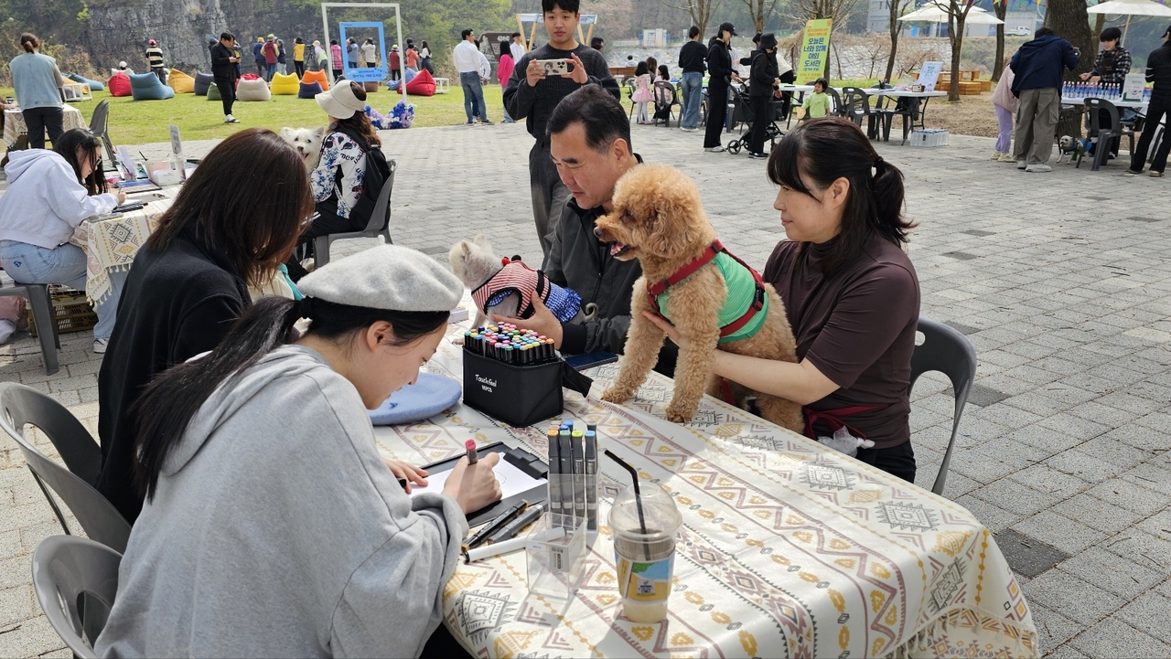 | 울산 울주 선바위공원에서 ‘찾아가는 야외도서관’과 함께 진행된 반려견 대상 ‘댕댕이 스쿨 도서관’ 프로그램에 참가한 주민과 반려견이 캐리커처 프로그램을 즐기고 있다. [울주군 제공] |