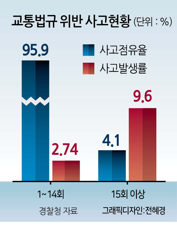이는 전체 운전면허 소지자의 0.5%, 전체 교통법규 위반자의 1.1%에 해당한다. 하지만 이들의 위반 건수는 418만1275건으로 전체 무인단속 건수(3727만9207건)의 11.3%를 차지했다.또한, 상습위반자가 일으킨 사고는 총 1만6004건으로, 사고 발생률(사고건수/위반자수)은 9.6%였다. 이는 일반 운전자의 사고율(2.7%)보다 3.5배 높은 수준이다.