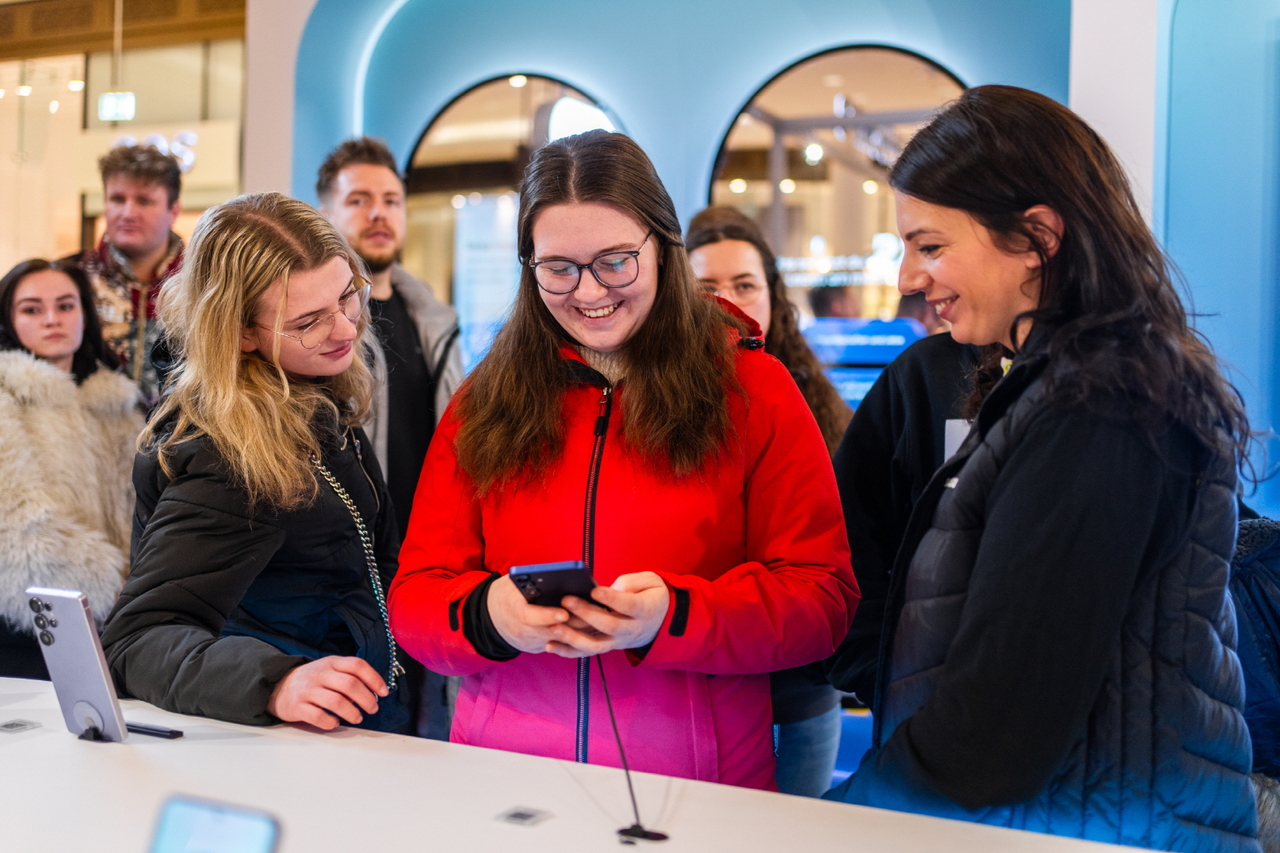 | 독일 베를린에 위치한 갤럭시 익스피리언스 스페이스(Galaxy Experience Space)에서 고객들이 갤럭시S25 시리즈를 살펴보는 모습. [삼성전자 제공] |
