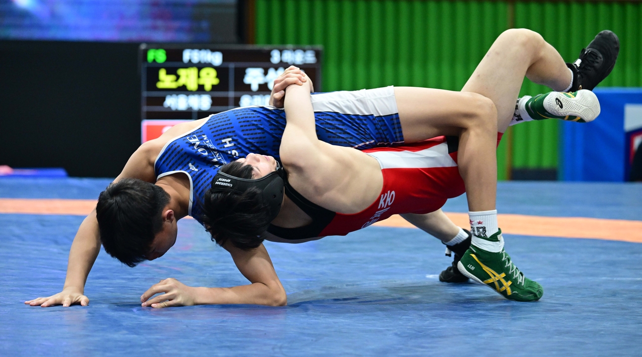 지난 15일 오전 심판의 휘슬 소리와 함께 중등부 자유형 51kg급 3라운드 경기에 출전한 두 선수의 몸이 맞붙었다. 한 치의 양보도 없는 눈빛 속, 순간적으로 들어간 태클에 매트가 진동했다. 숨을 고를 틈도 없이 이어진 옆굴리기! 관중석에선 탄성이 터져 나왔다. 기술과 힘, 집중력의 싸움은 단 1분 사이에 승부가 갈렸다. 헤드기어를 쓴 기민규(대구 경구중) 선수의 승리다.