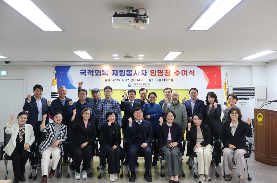 서울출입국·외국인청(청장 반재열, 이하 서울청)은 17일 오후 대회의실에서 대한민국 국적회복자 24명을 서울청 자원봉사자로 임명하고, 본격 활동에 들어간다고 밝혔다. 국적회복자 자원 봉사자 중에는 이전 미국 국적이 13명으로 가장 많고 캐나다 8명, 뉴질랜드 1명, 호주 1명, 중국 1명 순이다.