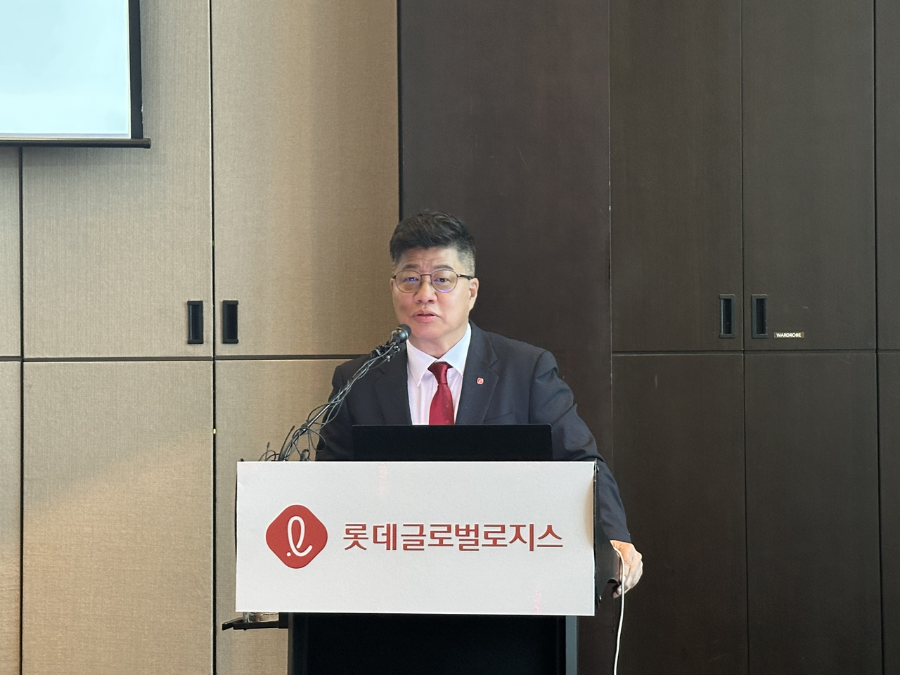| 강병구 롯데글로벌로지스 대표가 21일 서울 여의도 콘래드호텔에서 열린 IPO 기자간담회에서 발표를 하고 있다. 신주희 기자 |