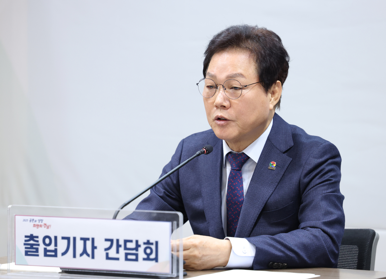| 박완수 경남도지사가 21일 오전 도정회의실에서 출입기자 간담회를 갖고 있다.[경남도 제공] |
