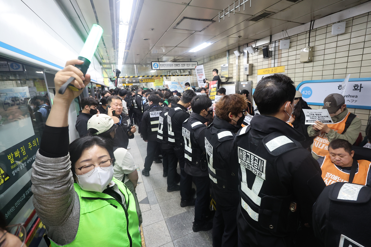 | 21일 서울 지하철 4호선 혜화역에서 열린 전국장애인차별철폐연대(전장연) 제62차 ‘출근길 지하철 탑니다’ 시위 중 서울교통공사 관계자들이 통행을 통제하고 있다. <연합뉴스> |