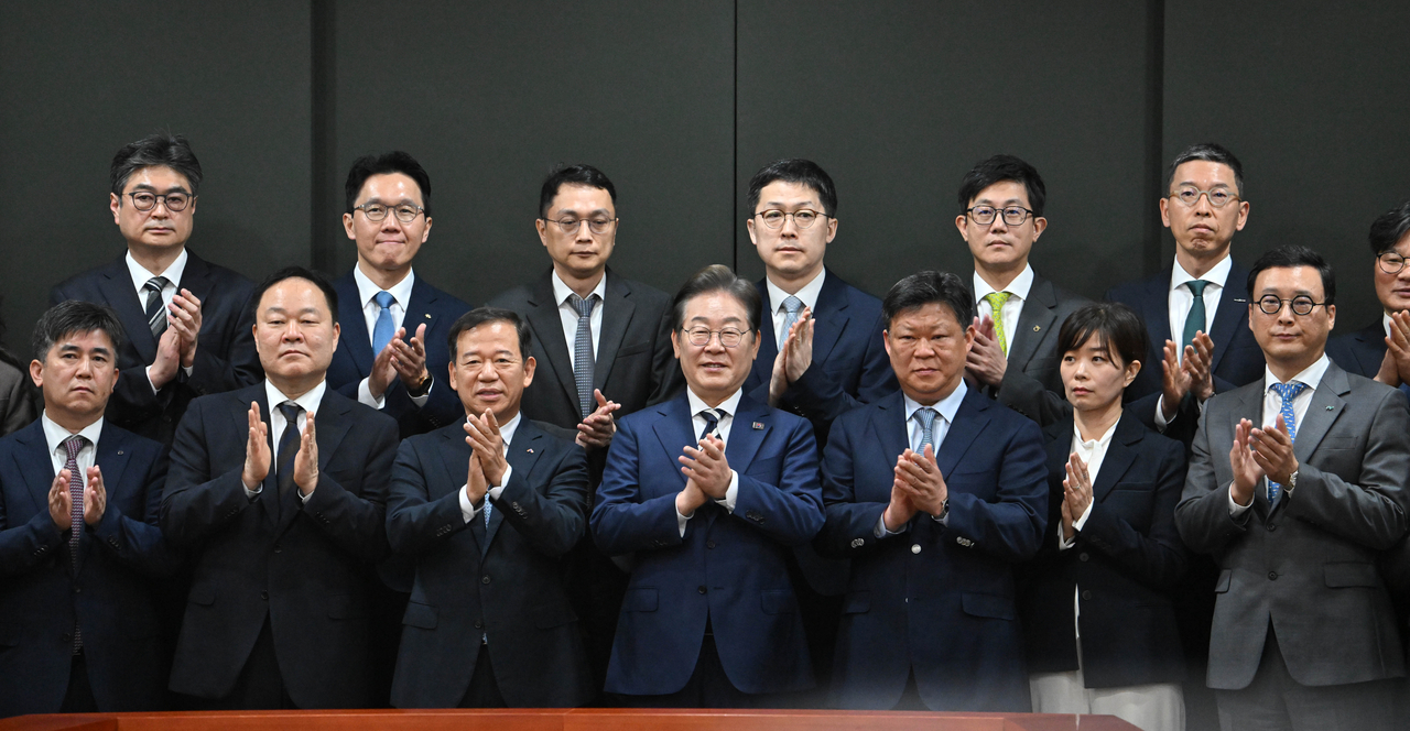 | 이재명(앞줄 가운데) 더불어민주당 대선 예비후보가 21일 오전 서울 여의도 금융투자협회에서 열린 자본시장 활성화를 위한 정책간담회에서 참석자들과 기념촬영을 하고 있다. 임세준 기자 |