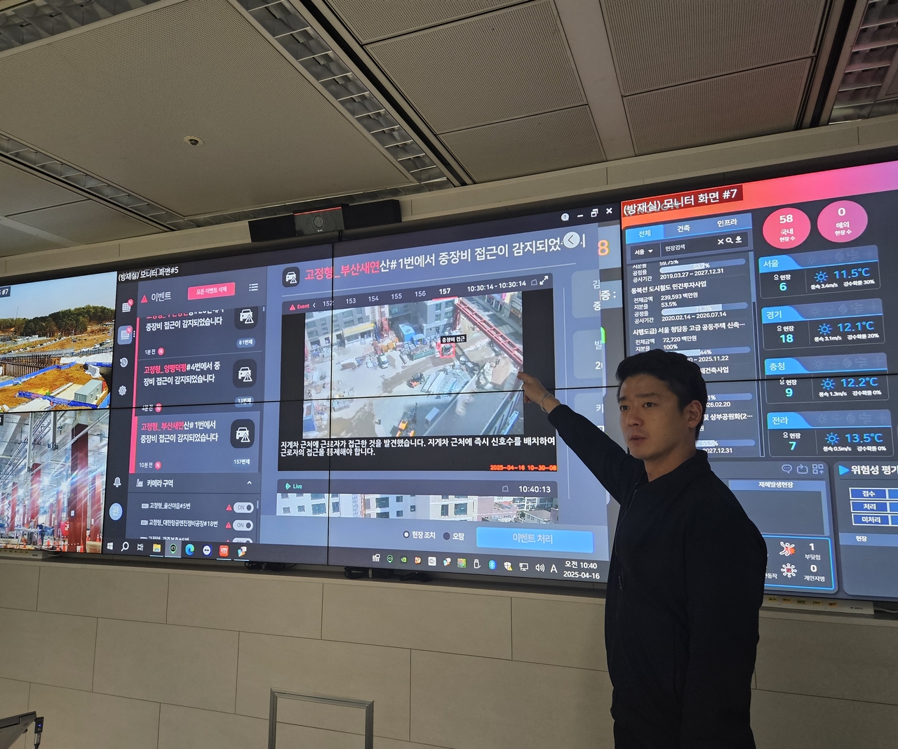 | 코오롱글로벌 직원이 과천 코오롱타워에 있는 통합관제센터에서 코오롱베니트 ‘AI 비전 인텔리전스’ 모델을 시연하는 모습 [코오롱베니트 제공] |