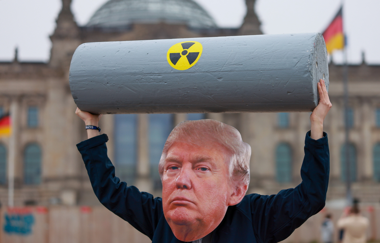 | 독일 베를린에서 지난 18일(현지시간) 평화 활동가들이 도널드 트럼프 미국 대통령의 모형을 쓰고 그를 풍자하고 있다. [EPA] |