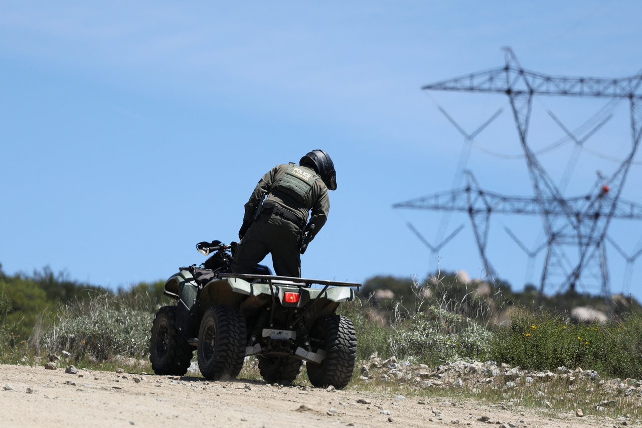 | 미 국경 순찰관이 20일(현지시간) 캘리포니아주와 접한 멕시코 국경 일대에서 사람들의 발자국을 확인하고 있다. [로이터] |