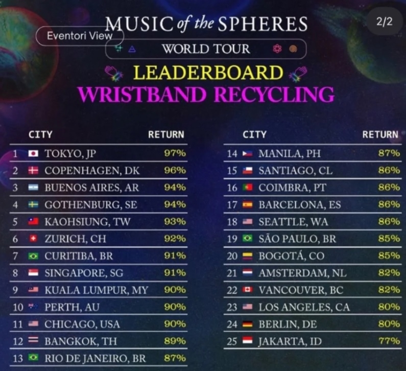 콜드플레이는 지난 2019년 과도한 탄소배출을 이유로 월드투어 중단을 선언하기도 했다. 이후 2021년 지속가능성을 강조하며 탄소배출량을 절반 이상 줄이겠다며 투어를 재개했다.