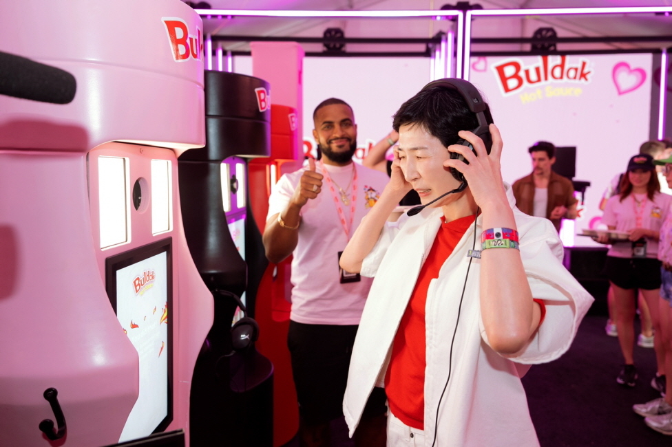 | 김정수 삼양식품 부회장이 11일 미국 캘리포니아 코첼라에 마련된 불닭소스 디지털 체험존을 경험 중이다. [삼양식품 제공] |
