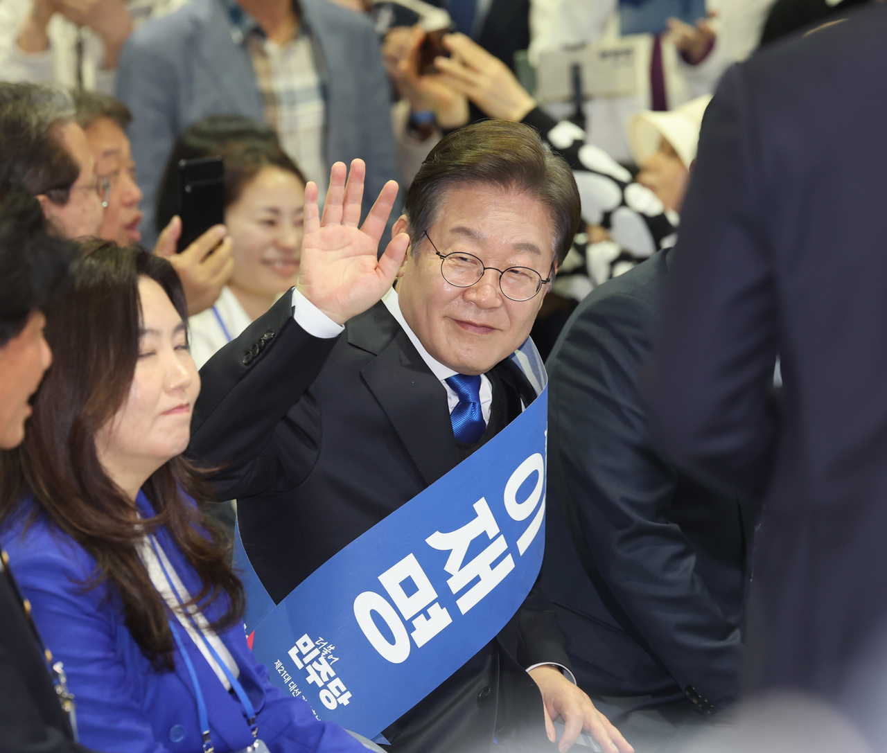 | 이재명 더불어민주당 대선 경선 후보가 20일 울산시 울주군 울산전시컨벤션센터에서 열린 ‘제21대 대통령선거 후보자 선출을 위한 영남권 합동연설회’에 이은 투표 결과 발표 후 지지자들에게 인사하고 있다. [연합] |