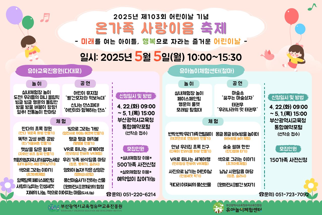 [헤럴드경제(부산)=조아서 기자] 부산시교육청 유아교육진흥원은 어린이날을 맞아 오는 5월 5일다대포 유아교육진흥원과 철마 유아놀이체험센터에서 3~5세 유아, 학부모, 시민 등을 대상으로 ‘온가족 사랑이음 축제’를 개최한다고 21일 밝혔다.