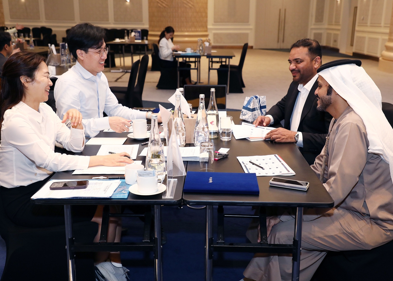 | 지난 2월 두바이에서 개최된 ‘2025 중동 ICT 로드쇼’에 참가한 한 기업이 바이어와 상담하고 있다. [코트라 제공] |