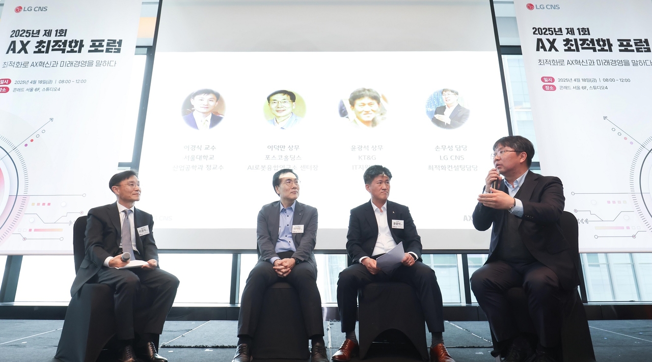| 손무성(오른쪽 첫 번째) LG CNS 최적화 컨설팅 담당이 ‘제1회 AX 최적화 포럼’ 패널 토의에서 발언하고 있다. [LG CNS 제공] |