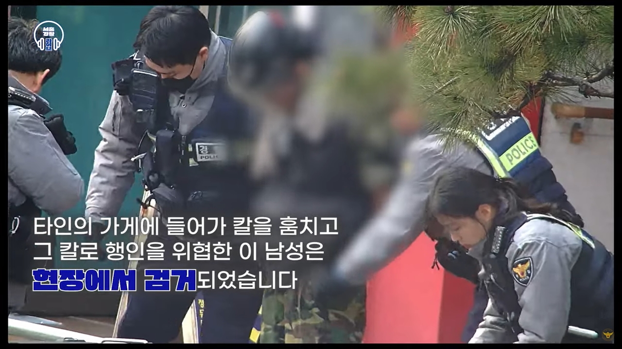 최근 서울경찰 유튜브에 게재된 ‘서울 한복판 식칼 들고 행인들 위협한 남성 체포’라는 제목의 영상에 따르면 지난달 서울 도심 길거리에서 A씨가 인근 호프집에 들어가 직원을 협박하며 칼을 막무가내로 빼앗는 일이 발생했다.