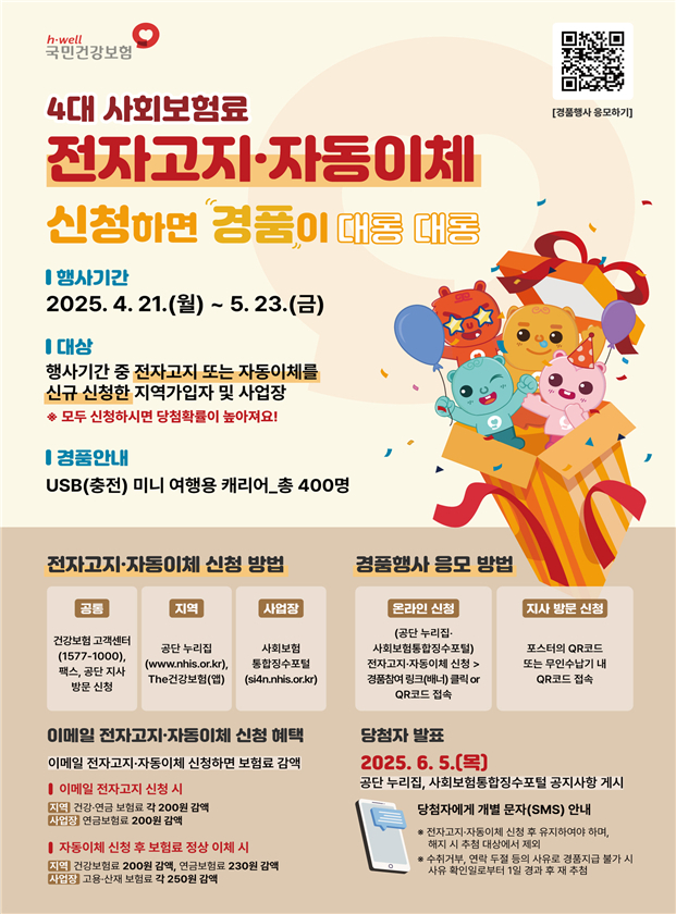 이번 경품행사는 4월 21일부터 5월 23일까지 진행되며, 대상은 4대 사회보험료 전자고지와 자동이체를 신규 신청한 지역가입자(세대) 및 사업장이다.