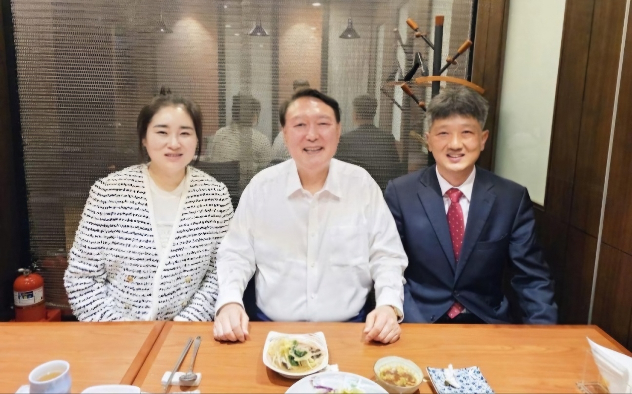 | 윤석열(가운데) 전 대통령이 19일 서울 서초동 아크로비스타 인근 식당에서 김계리(왼쪽) 변호사와 배의철(오른쪽) 변호사를 초대해 식사를 하고 있다. [김계리 변호사 SNS] |
