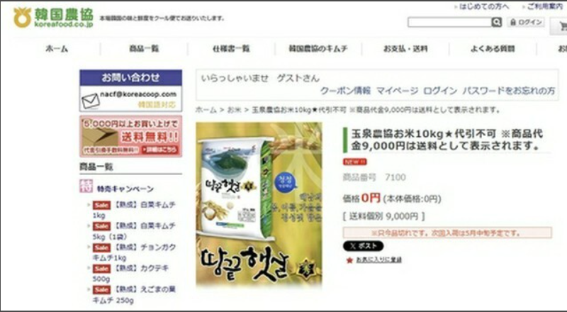 | 한국농협 쌀 판매 일본어 페이지. [연합] |