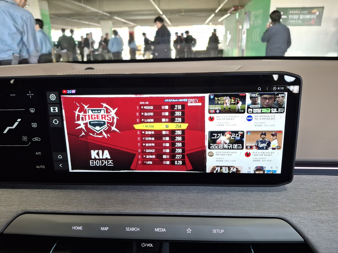 | 기아 EV4 센터디스플레이를 활용해 기아타이거즈의 전날 경기 하이라이트를 시청하고 있다. [김성우 기자] |