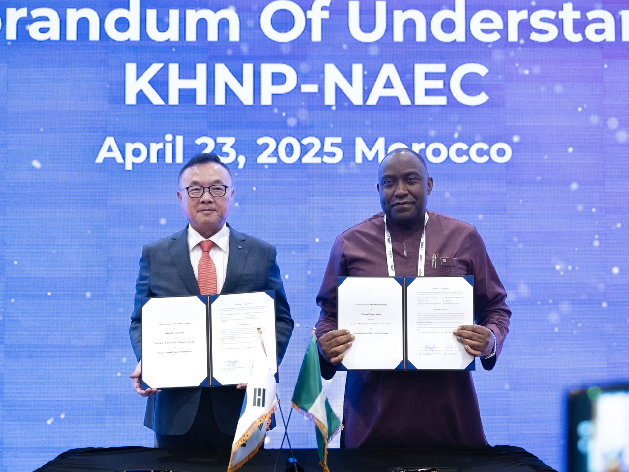| 황주호 한국수력원자력 사장이 22일(현지시간) 모로코 라바트에서 열린 아프리카 원자력 콘퍼런스(AFNBP)에서 나이지리아 원자력에너지위원회와 원자력 분야 협력에 대한 양해각서를 체결한 후 기념쵤영을 하고 있다.[한국수력원자력 제공] |