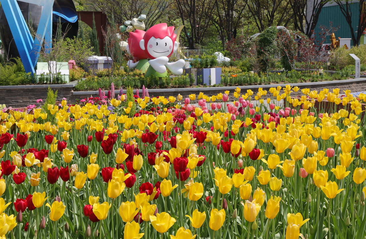 | 경기도 고양시 일산호수공원에 활짝 핀 튤립이 관람객을 기다리고 있다. |