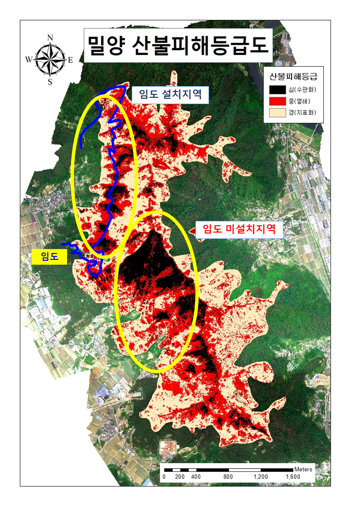 실례로, 지난 2022년 밀양 산불의 피해 정도를 살펴보면 임도가 설치된 북서쪽 지역의 피해는 적은 반면 임도가 없는 중앙부나 남쪽 지역의 경우 피해가 더 넓고 피해 정도도 큰 것을 확인할 수 있다.