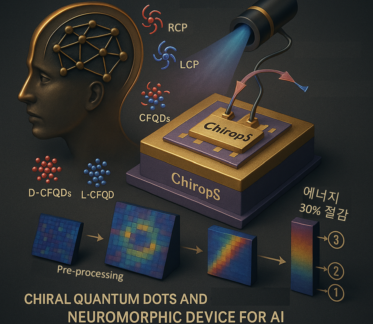 KAIST는 염지현 신소재공학과 교수 연구팀이 빛에 의해 비대칭 반응하는 카이랄성과 자성을 동시에 갖는 특수 나노입자인 양자점(CFQD)을 세계 최초로 개발하고 저전력 인간 뇌 구조와 작동 방식을 모방한 인공지능 뉴로모픽 소자(ChiropS)까지 성공적으로 구현했다고 25일 밝혔다.