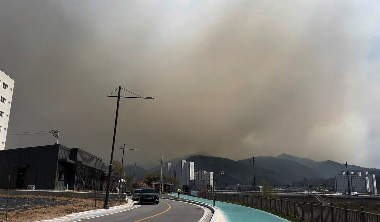 | 26일 오후 1시 18분께 강원 인제군 상남면 하남리 한 야산에서 발생한 산불로 인해 인제 시내가 자욱한 연기에 뒤덮여 있다.[독자 제공] [연합] |