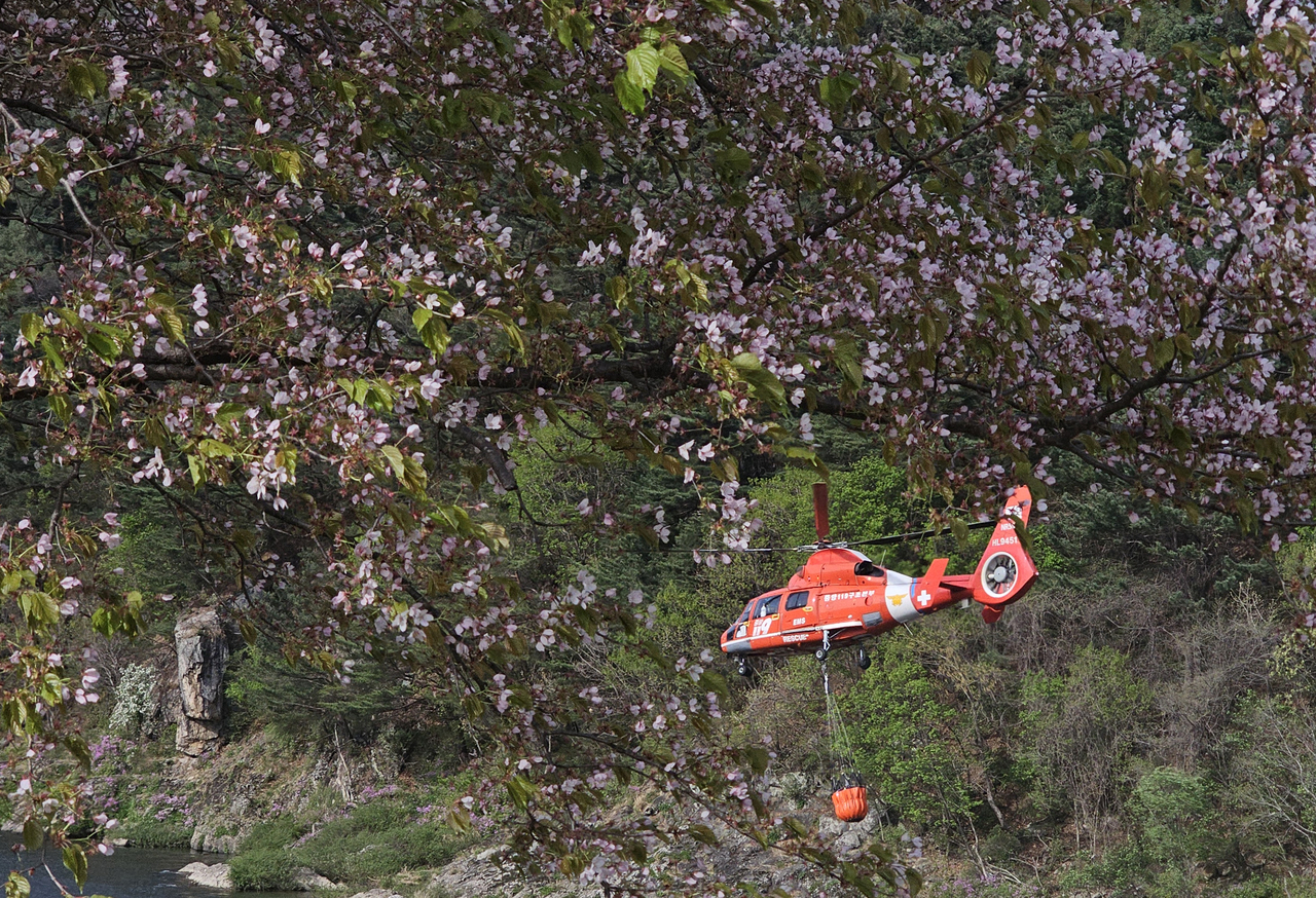 | 27일 강원 인제군 내린천에서 산불 진화 헬기가 용수를 담은 뒤 화재 현장으로 향하고 있다. [연합] |