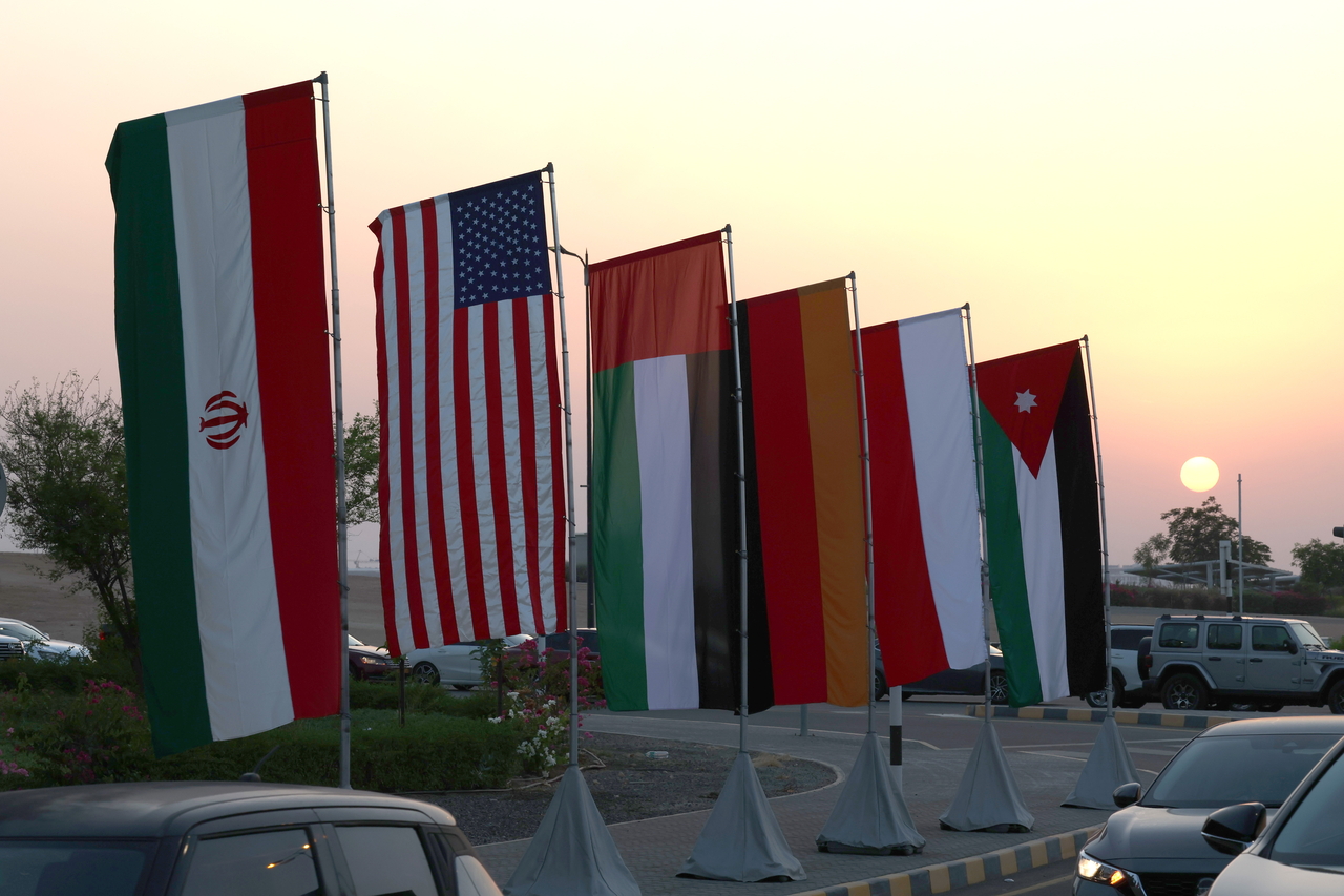 | 2025년 4월 25일 오만 무스카트에 미국과 이란의 국기가 걸려 있다. 이란과 미국은 2025년 4월 26일 무스카트에서 3차 핵 회담을 개최했다. [EPA] |