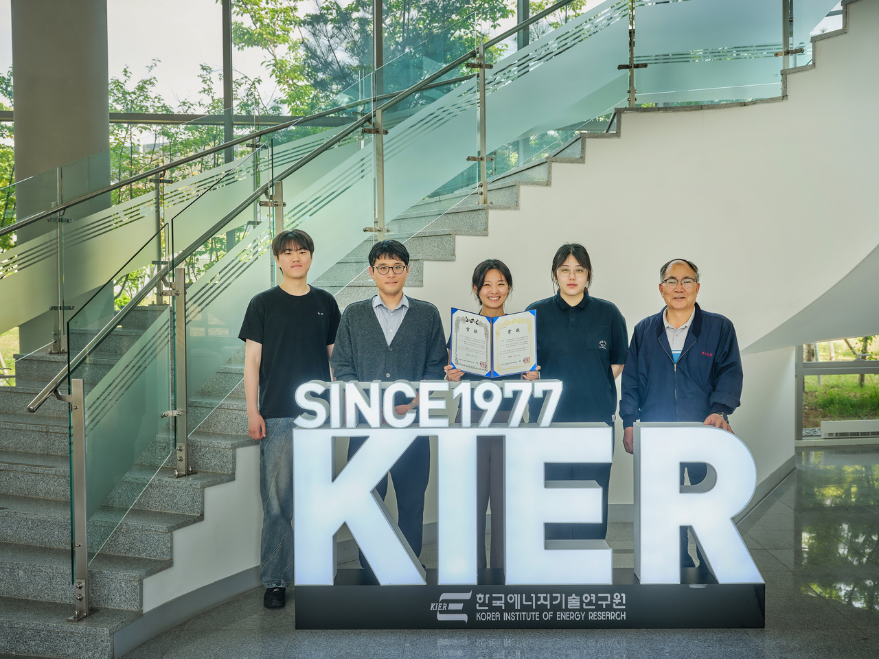 | 이번 연구를 수행한 연구진. 김재희(왼쪽부터) 학생연구원, 강성민 박사, 황은비 학생연구원, 윤수빈 학생연구원, 백동현 박사.[한국에너지기술연구원 제공] |