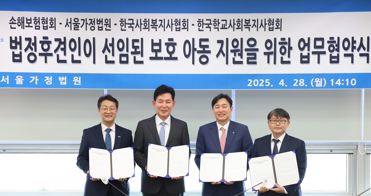 손해보험협회(회장 이병래·왼쪽 세 번째)는 서울가정법원·한국사회복지사협회·한국학교사회복지사협회와 함께 법정후견인의 보호를 받는 아동과 청소년을 지원하는 사업에 나선다.
