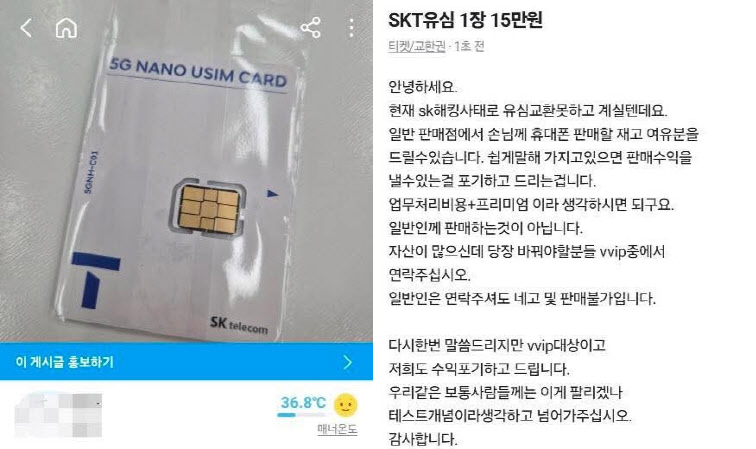 SK텔레콤 판매점 관계자라고 밝힌 글쓴이는 “현재 해킹 사태로 유심 교환을 못 하고 계실 것”이라며 “일반 판매점에서 판매할 재고 여유 분을 드릴 수 있다”고 밝혔다. 단, 특별 최우대 고객(VVIP)에게 제공한다는 조건을 달았다.