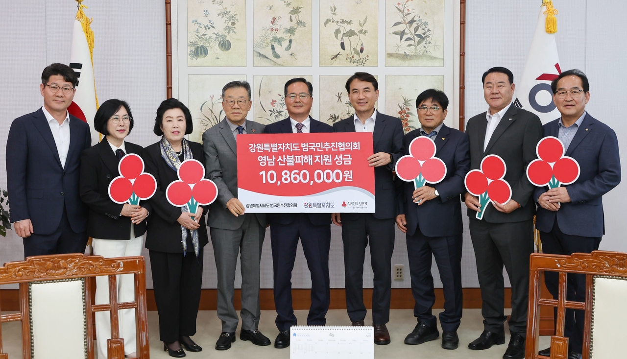 이번 성금은 강원특별자치도 범국민추진협의회 위원 440여명이 대형 산불로 삶의 터전을 잃은 영남지역 피해 주민들을 돕기 위한 것으로, 강원사회복지공동모금회를 통해 피해 주민의 생계 지원과 복구 활동 등에 사용될 예정이다.