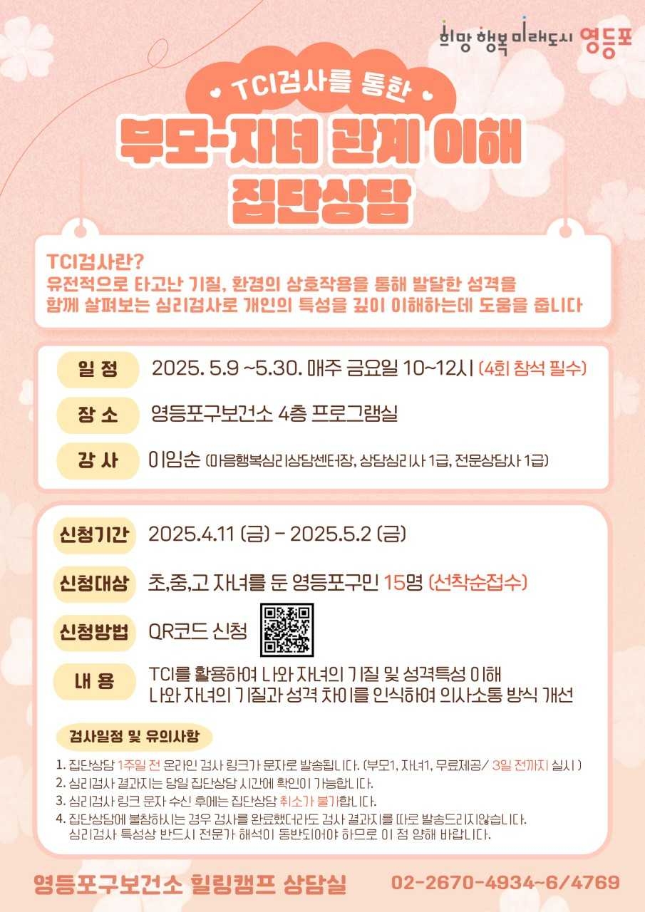 집단상담은 총 4회차로 구성되며, 5월 9일부터 매주 금요일 영등포구 보건소 4층 프로그램실에서 진행된다. 참여자는 사전 실시한 TCI 검사 결과를 바탕으로, 각자의 양육 상황에 맞는 전문 상담가의 피드백을 받는다.