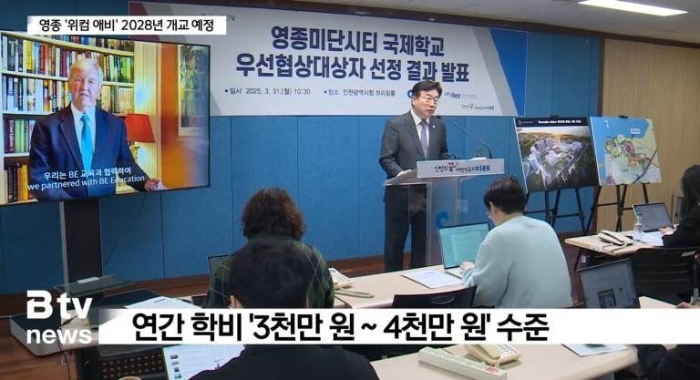 | 윤원석 인천경제청장이 지난달 31일 인천시청에서 영종 국제학교 우선협상대상자 선정 결과를 발표하고 있다. 사진 화면 왼쪽 동영상에는 영국에 소재한 프랜차이즈를 통해 학교를 설립하는 업체 WAIL(위컴 애비 국제 주식회사) 소속 패트릭 쉐링턴(Patrick Sherrington) 회장이 “BE 교육과 협력한다”라는 멘트가 나오고 있다.[사진은 Btv 뉴스 화면 캡처] |