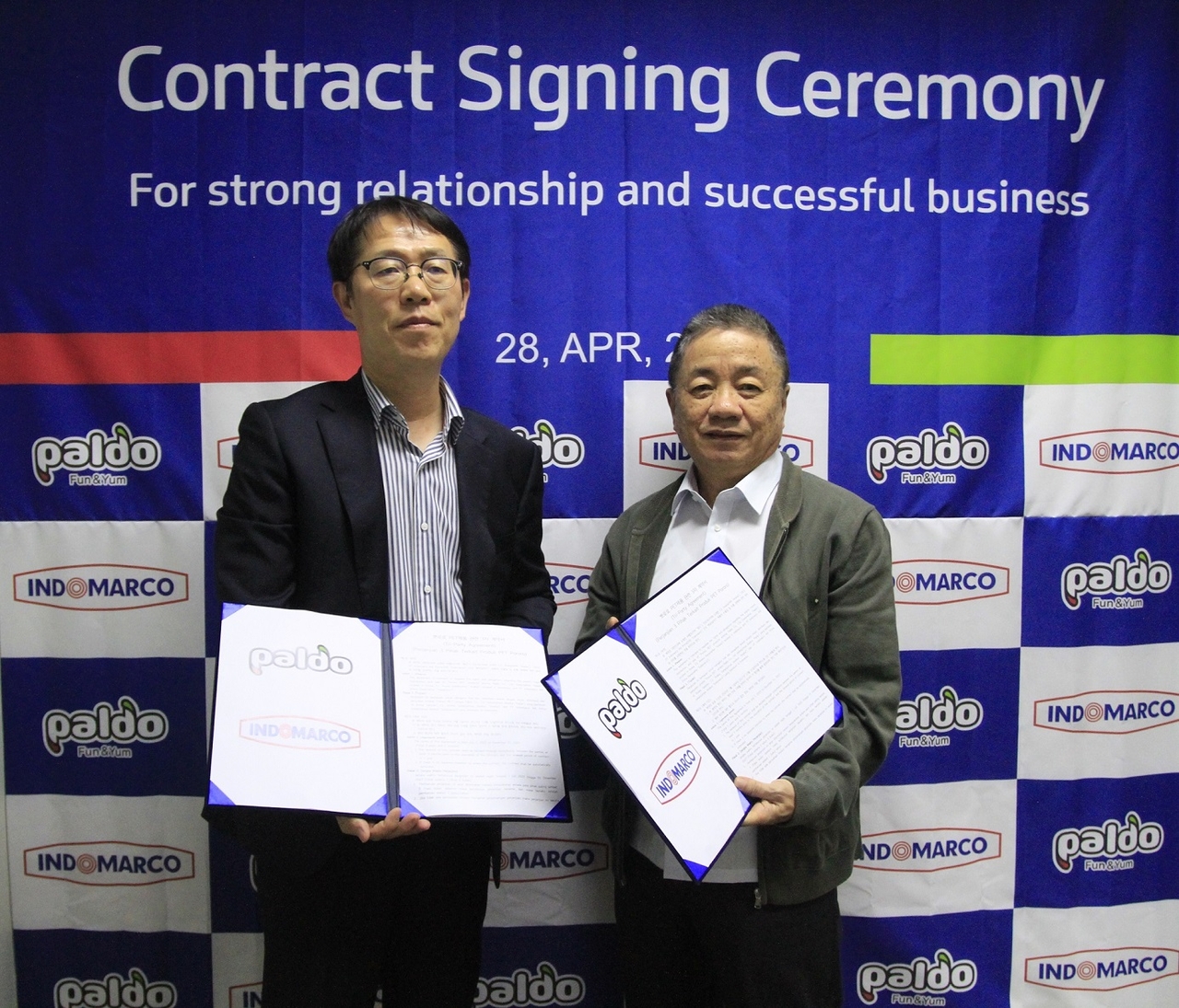 | 권성균 팔도 대표이사와 조디안토 소요노포에트로(Joedianto Soejonopoetro) 인도마르코 대표이사가 기념촬영을 하고 있다. [팔도 제공] |