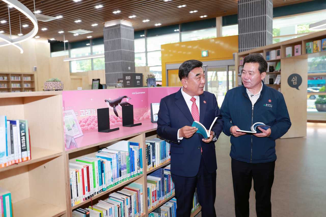 | 김두겸 울산시장(왼쪽)이 29일 기자회견을 열어 울산시민의 자부심을 제고하는 정책을 발표한 뒤 도서관으로 새 단장한 울산시청 본관 1층의 ‘울산책방’을 둘러보고서 임현철 대변인과 이야기를 나누고 있다. [울산시 제공] |