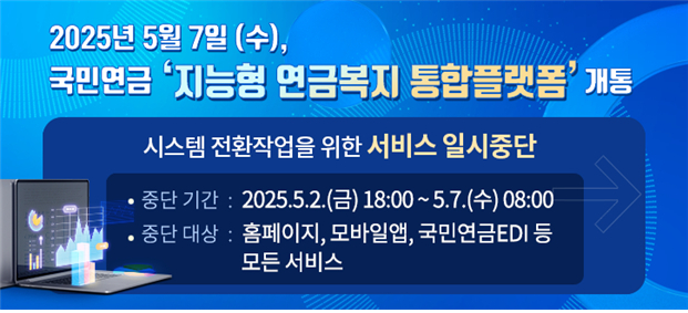 통합플랫폼 시스템 개통을 위해 연금공단은 5월 2일 금요일 18시부터 5월 7일 수요일 8시까지 시스템 전환 작업을 진행하며, 이 기간 동안 홈페이지, 모바일앱 등 모든 온라인 서비스가 일시 중단된다.